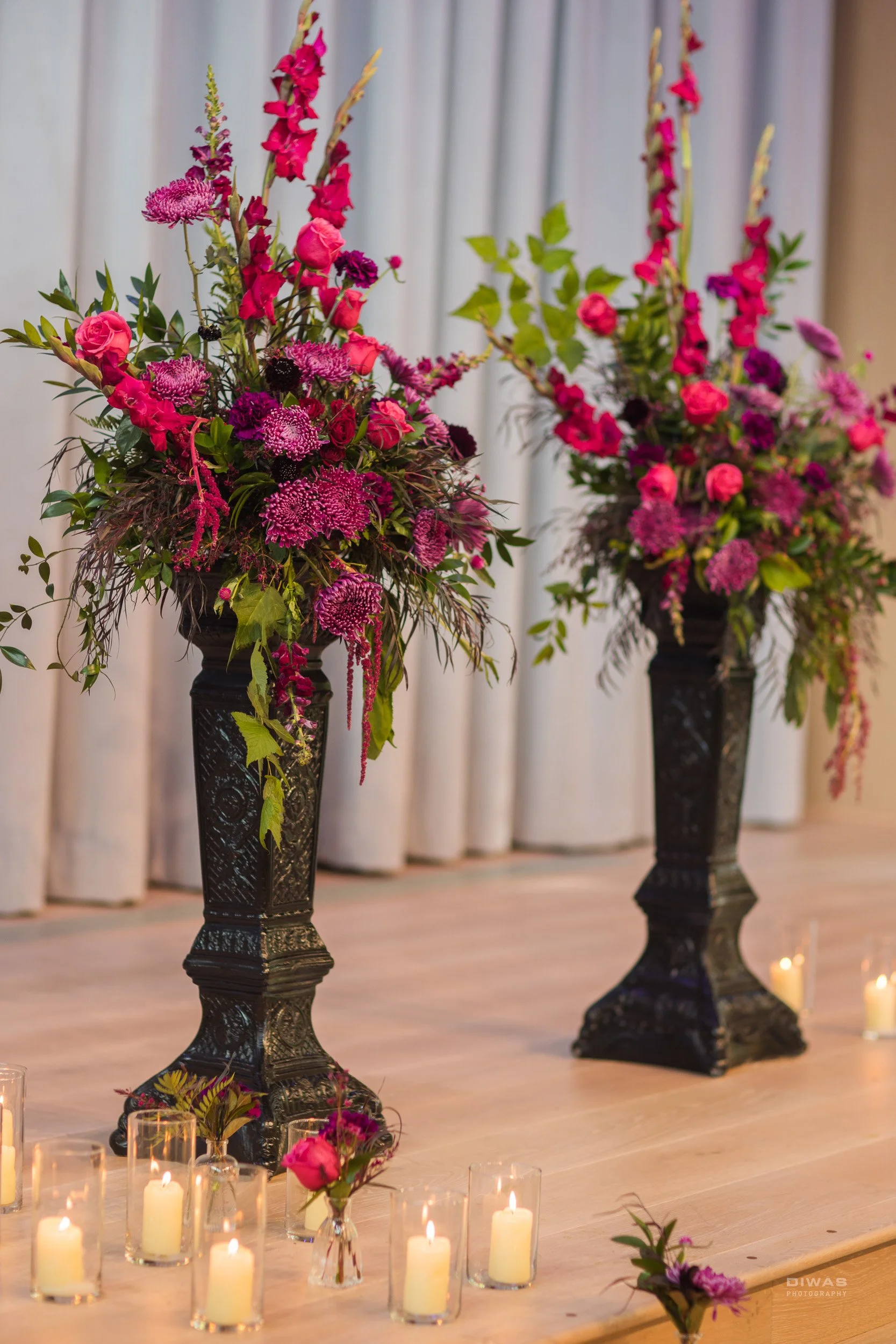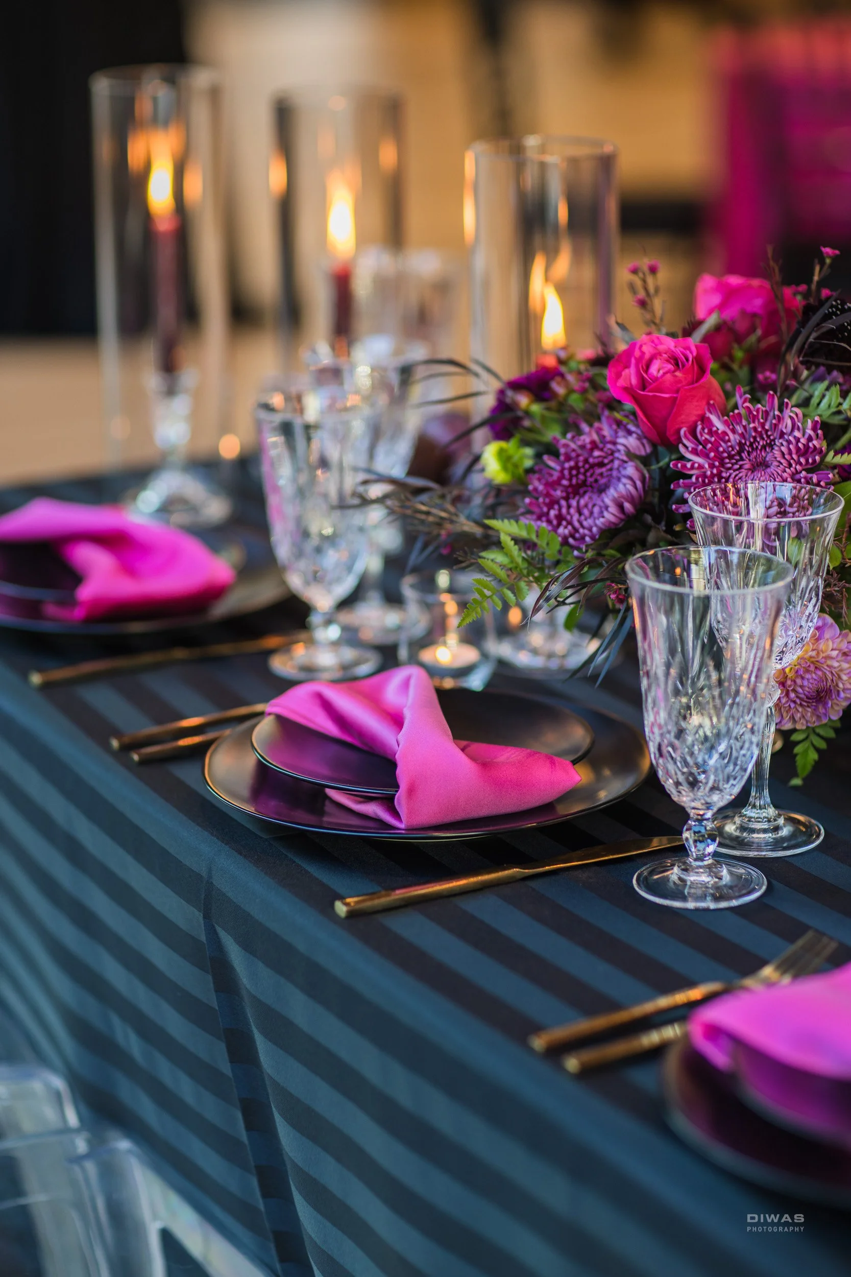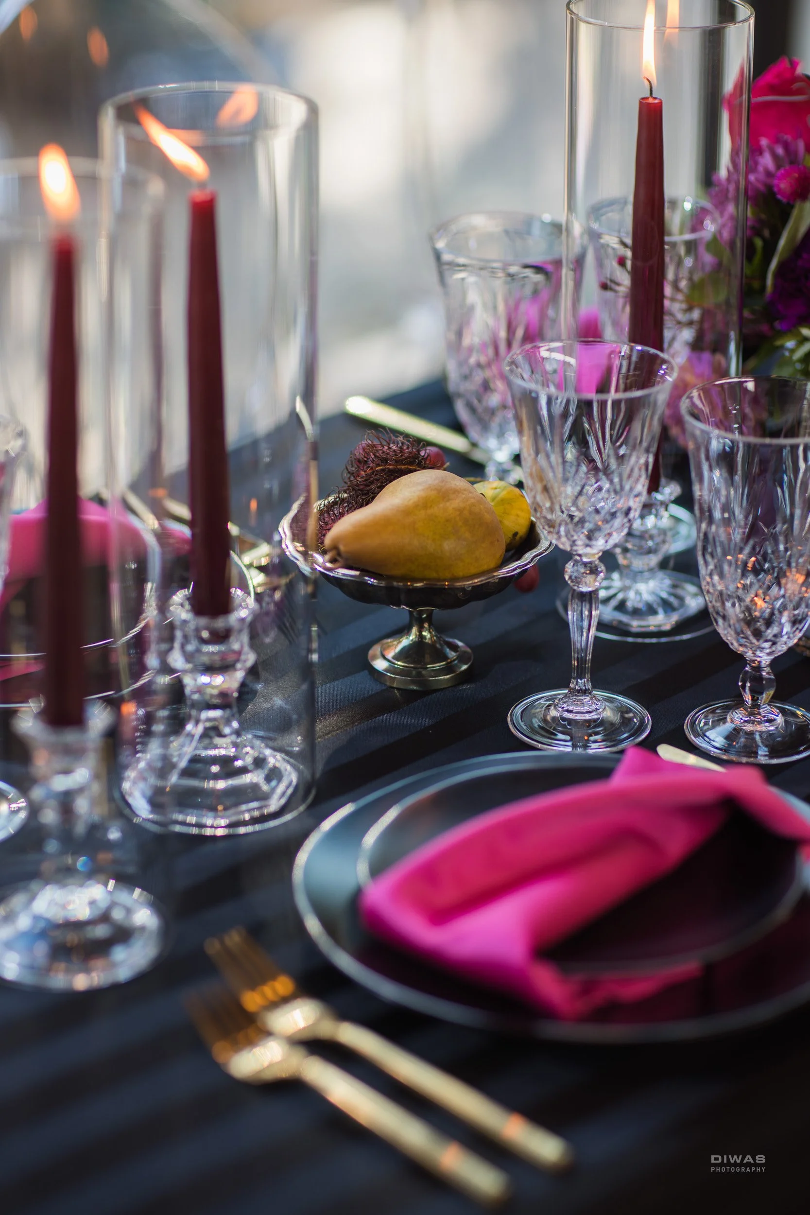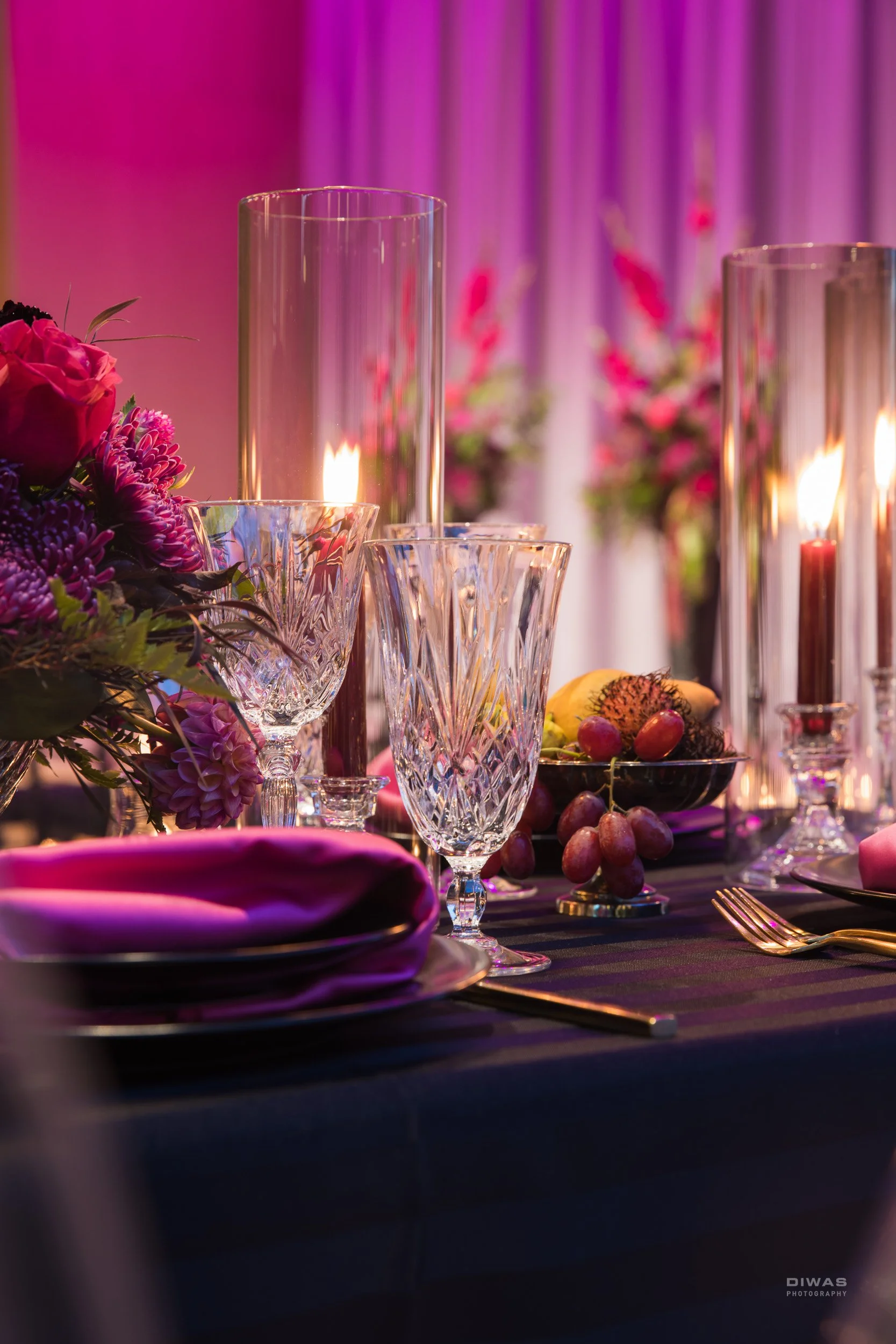 Moody and Fruity is a concept inspired by a dark, rich color story and bountiful edible centerpieces. We were so excited to bring the vision to life at Parkview Event Space for their October ‘23 open house. The journey started in their meditation hall that we transformed into the Marrier’s Lounge where our couple would be able to get ready and also escape for a quite moment as the desired during their wedding day. The Sanctuary was transformed into a dramatic ceremony scene and featured a show piece tablescape that was SO FUN to design. How did we do with the moody and the fruity!?