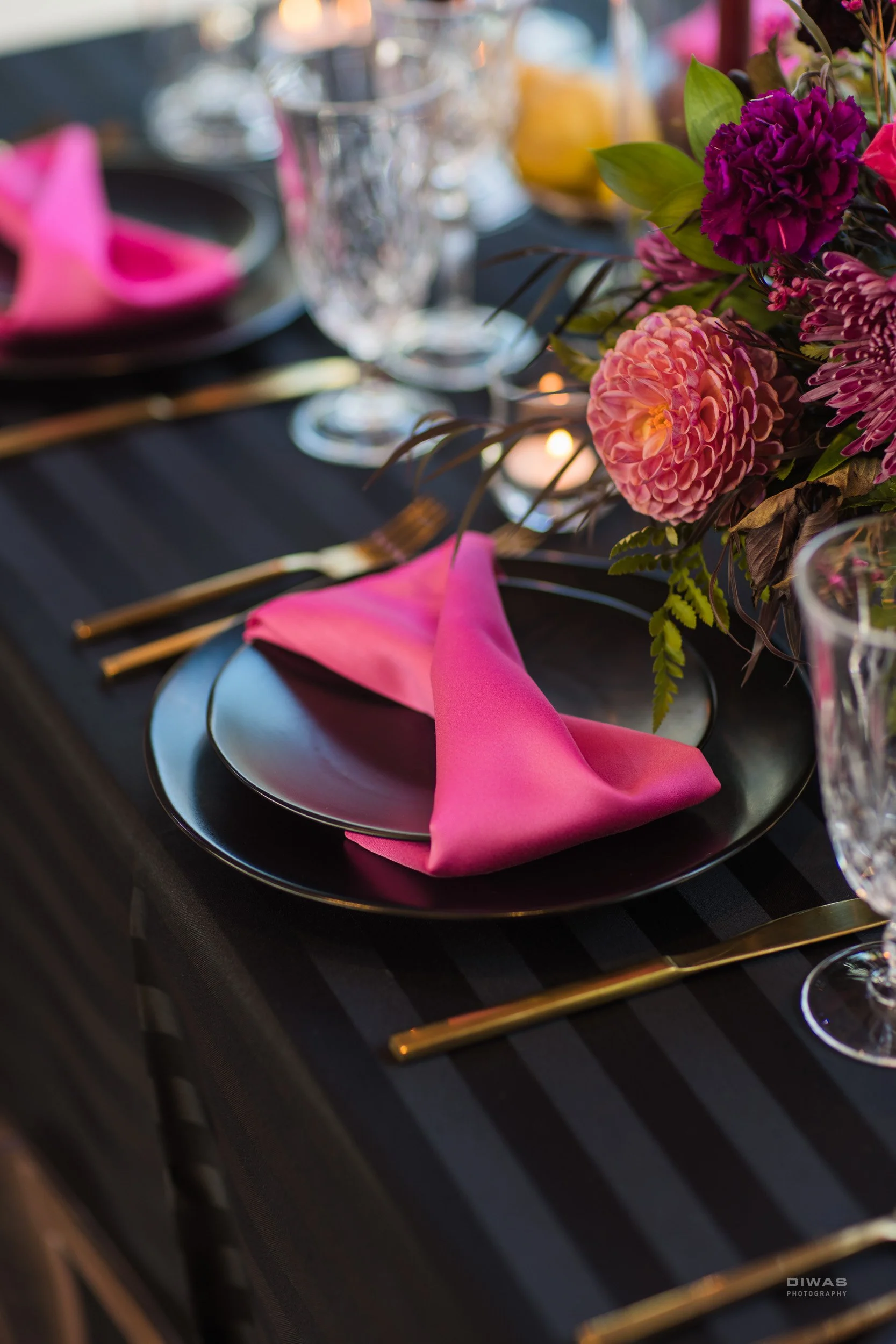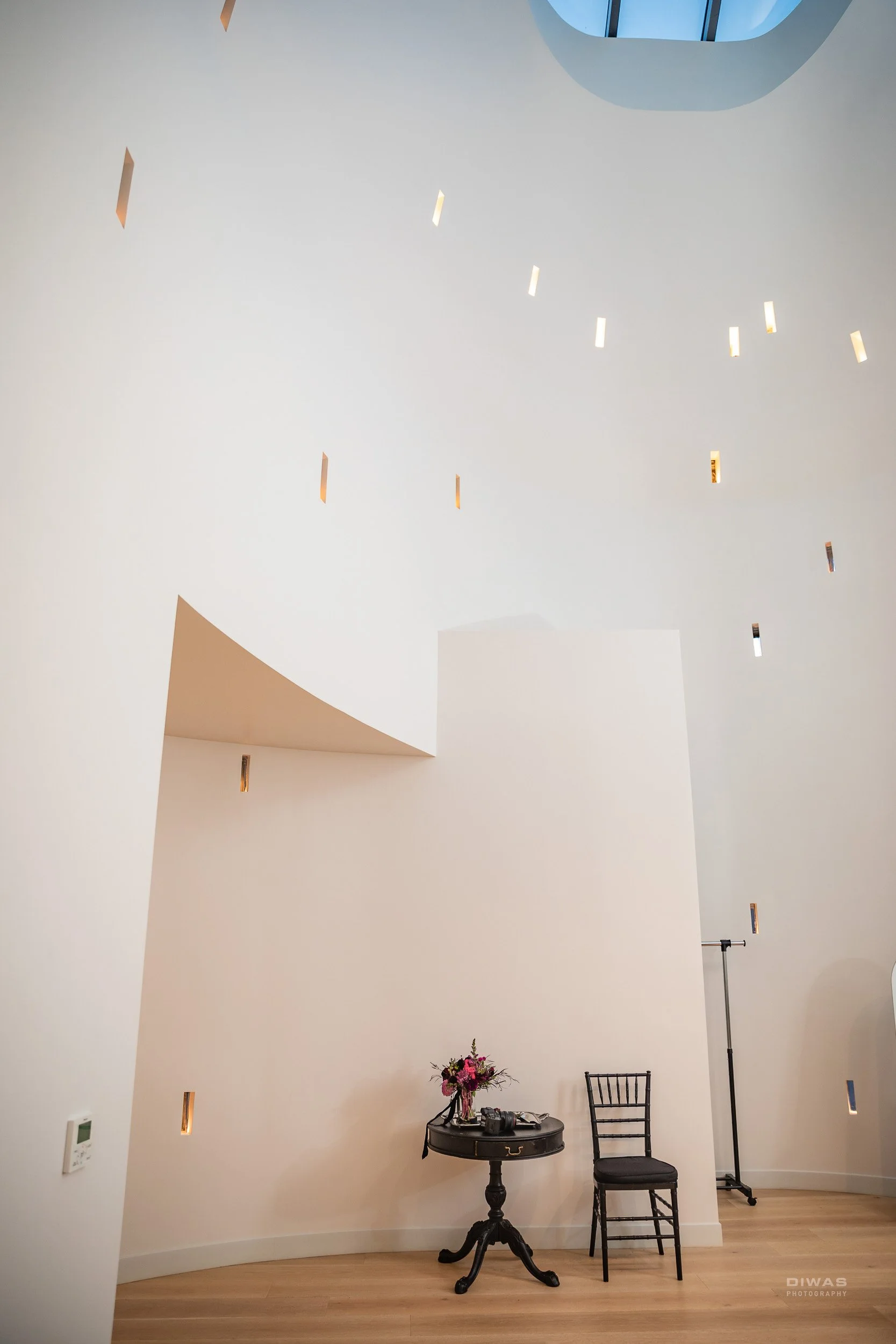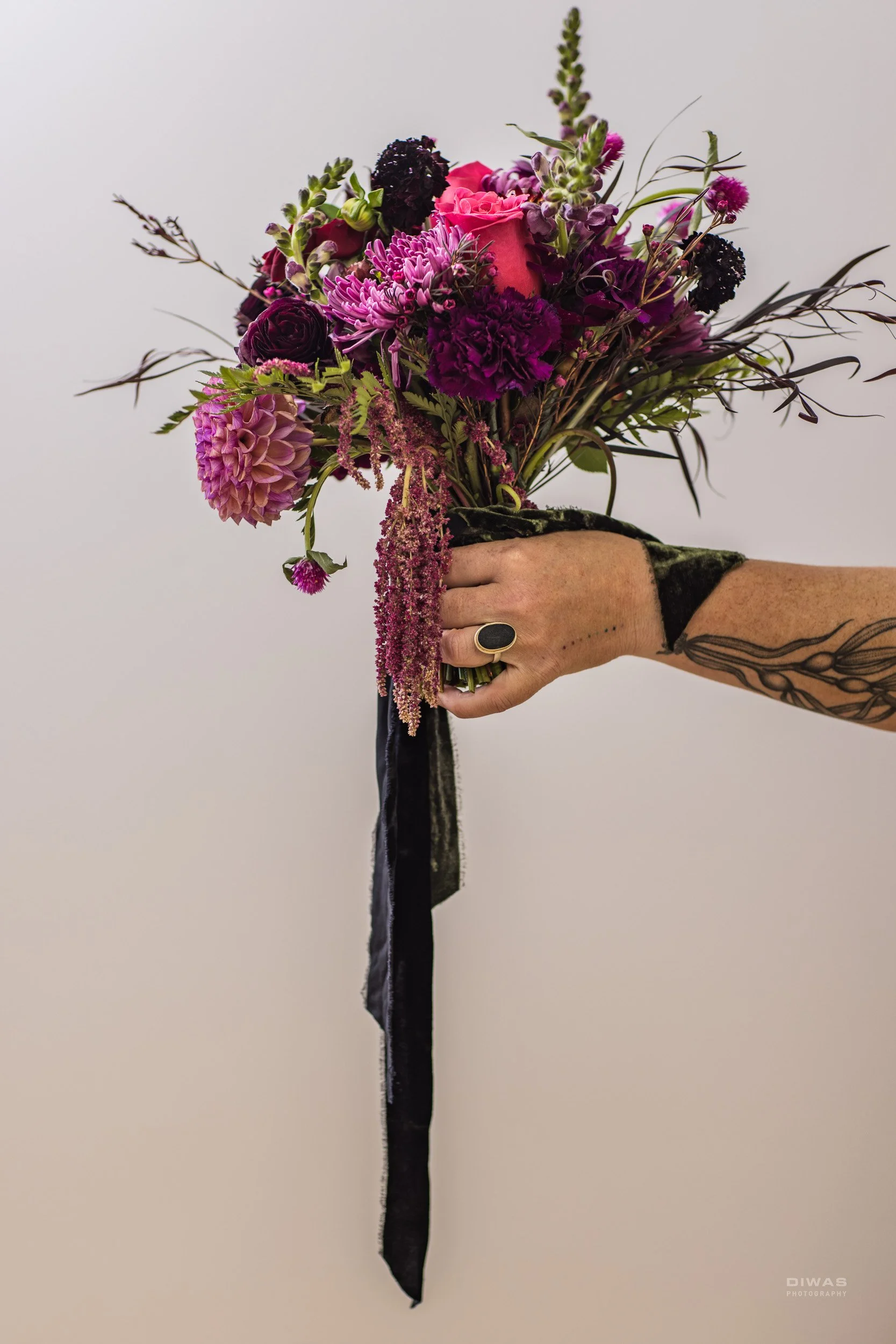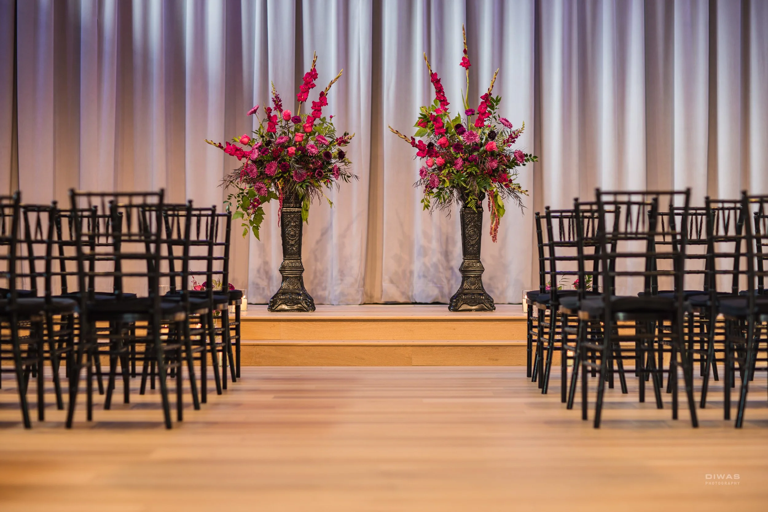 Moody and Fruity is a concept inspired by a dark, rich color story and bountiful edible centerpieces. We were so excited to bring the vision to life at Parkview Event Space for their October ‘23 open house. The journey started in their meditation hall that we transformed into the Marrier’s Lounge where our couple would be able to get ready and also escape for a quite moment as the desired during their wedding day. The Sanctuary was transformed into a dramatic ceremony scene and featured a show piece tablescape that was SO FUN to design. How did we do with the moody and the fruity!?